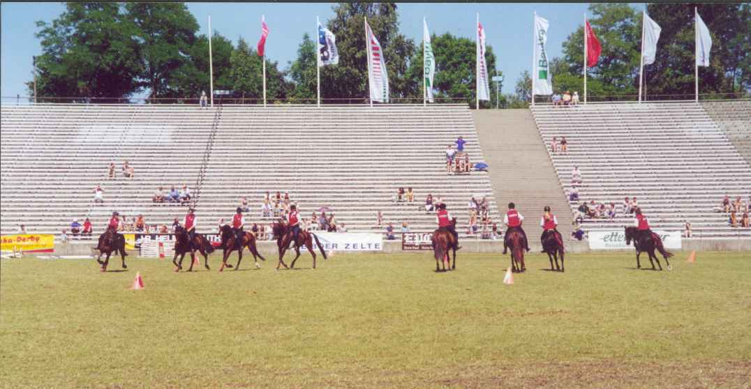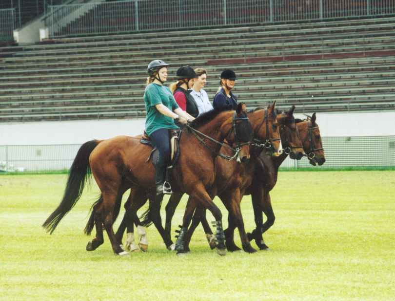 Jetzt hatten wir also unseren ersten großen Auftritt, auf der Messe "Pferd International" in München-Riem im Showprogramm. Wir maschierten in großer Formation in das Stadion ein und zeigten dann die Traberquadrille, für die wir so lange geübt hatten . Derweil fuhren die Traber in den Sulkys außen herum. Dann ritten wir alle noch über ein paar Hindernisse: Sprung, Brücke, Plane, Stangen... und verabschiedeten uns mit einer Ehrenrunde im fetzigen Galopp. So ein Stadion hat schon was !